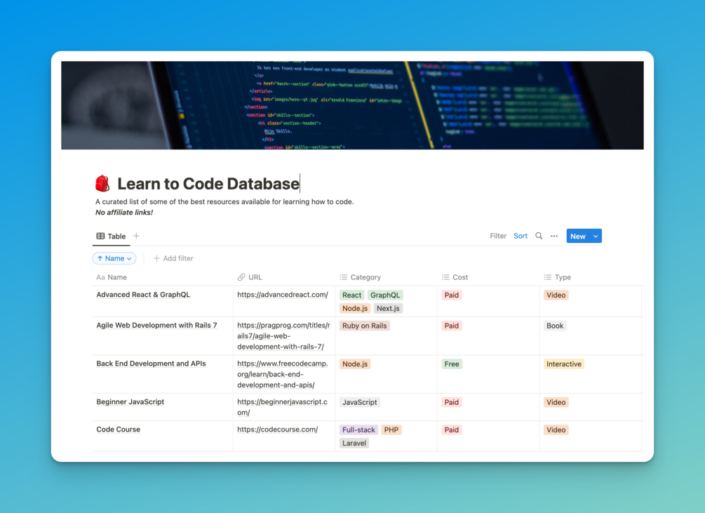 The Learn to Code Database is a Notion database that contains over 100+ resources where you can learn how to code. The database is organized by: